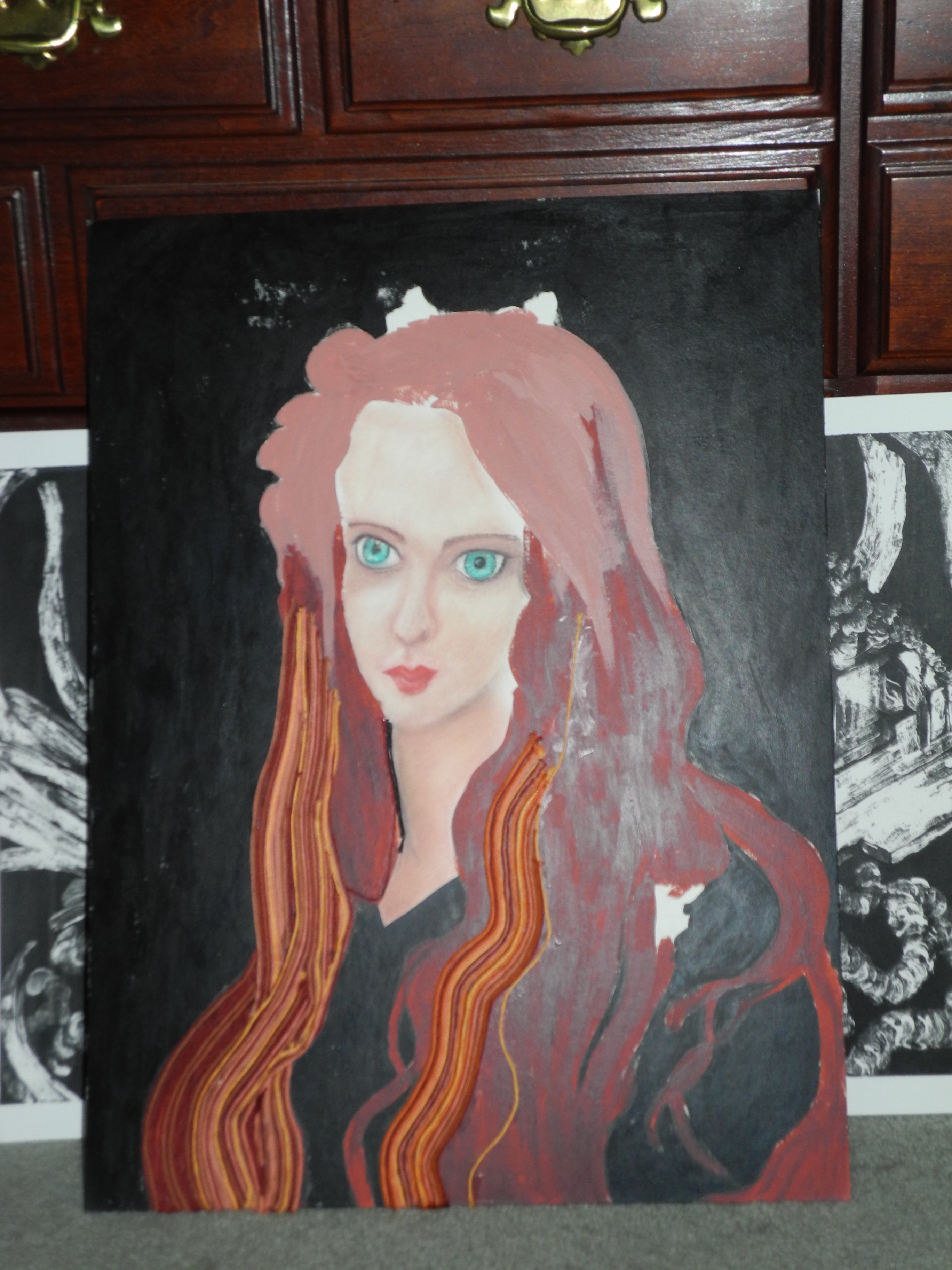 Uploaded June 4, 2014 by kurolaceUnfinished mixed media of Ophelia based on a classical painting. Google it…lol. Hair is embroidery floss, pastels for skin and face, she doesn’t have horns – there is a vine and flowers entangled in her hair. I was going to do those with silk fabric.