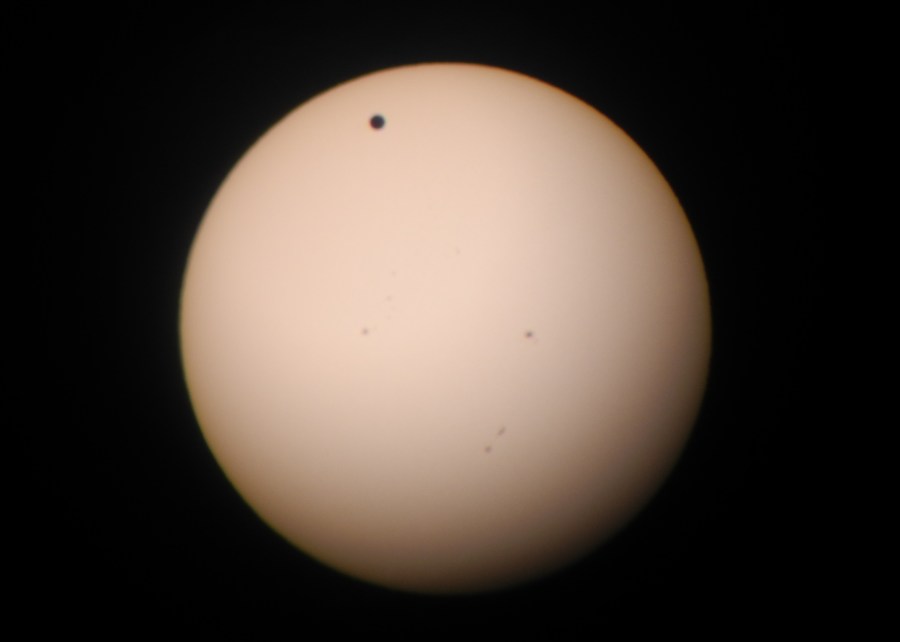 On Tuesday we had the telescope set up again in the backyard, so I took a picture of Venus, beginning to cross the sun. The dark big spot is of course Venus, and the small spots are sun spots.