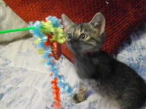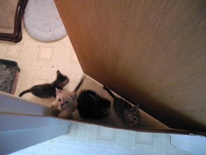 Our adult cat, Zsa Zsa, is none too pleased with the kittens being here. So we have to try to keep them separate. A few days ago Zsa Zsa got really sick… she’s had a fever and wasn’t eating. My parents took her to the vet and he gave her a shot of antibiotics and a vit D shot (“to peak her appetite)… but it wasn’t until today she started eating again. We don’t think it was the kittens that made her sick …. since they haven’t really been in contact…. actually my mom says she thinks maybe Zsa Zsa ate a roach or something like that.