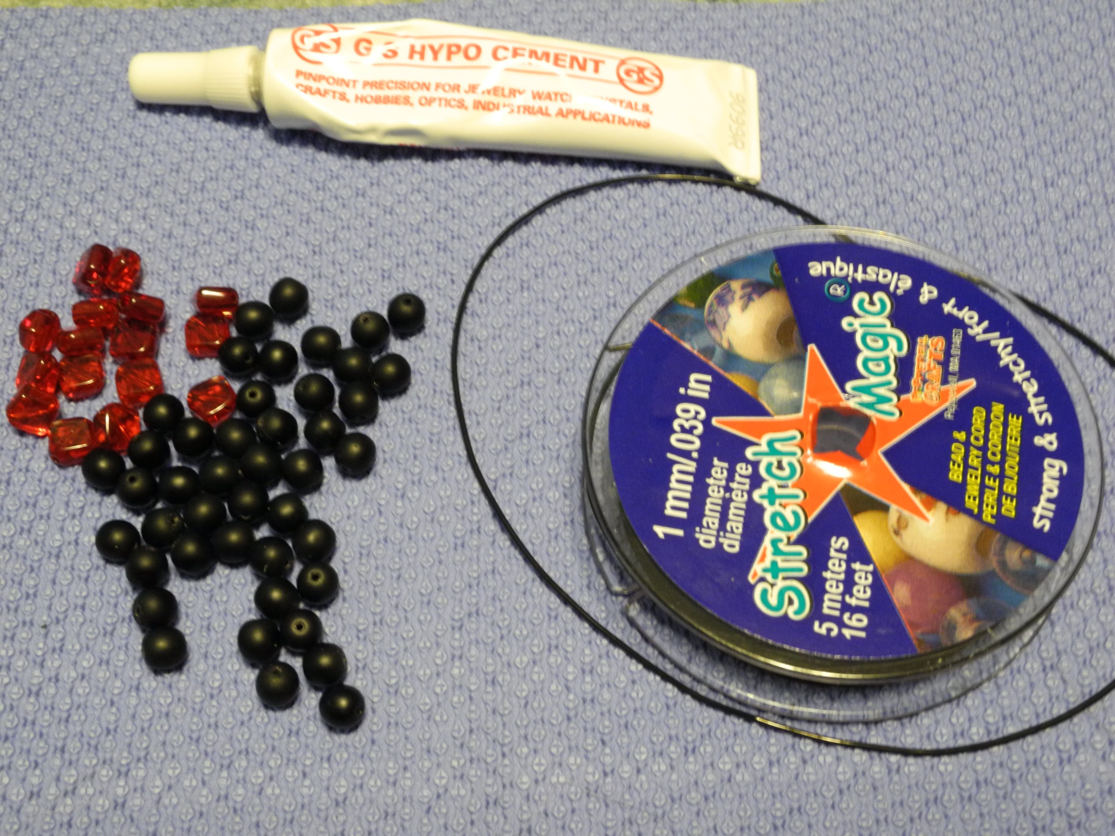 • Some beads (I’m using black 6mm matte glass beads & flat diamond-shaped red glass beads)
