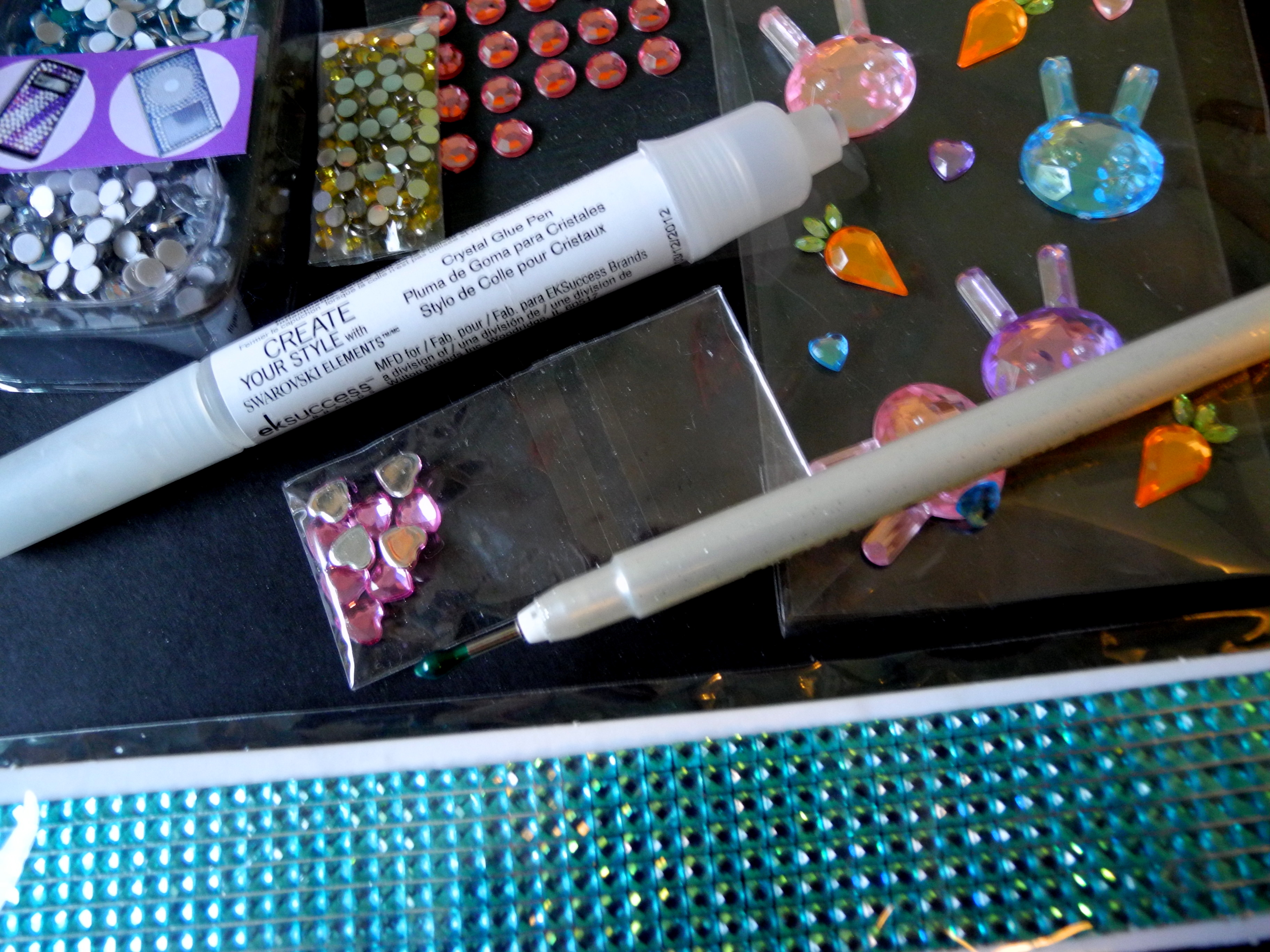So I decided to try to beautify it a little bit. All you need to do this is some rhinestones, or rhinestone stickers, and some glue. Also the little “rhinestone picker-uper” is useful if you use small rhinestones.